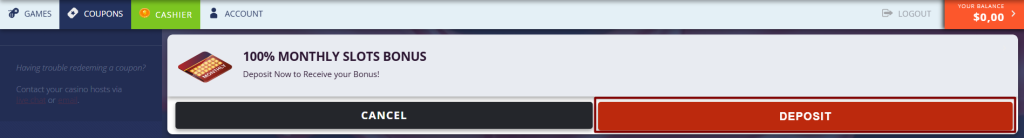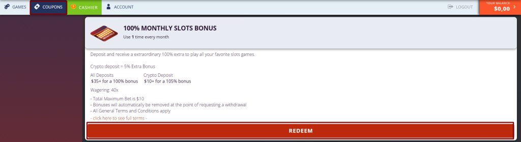 Once your deposit is processed and the coupon is active, the bonus funds will appear in your balance.