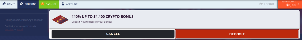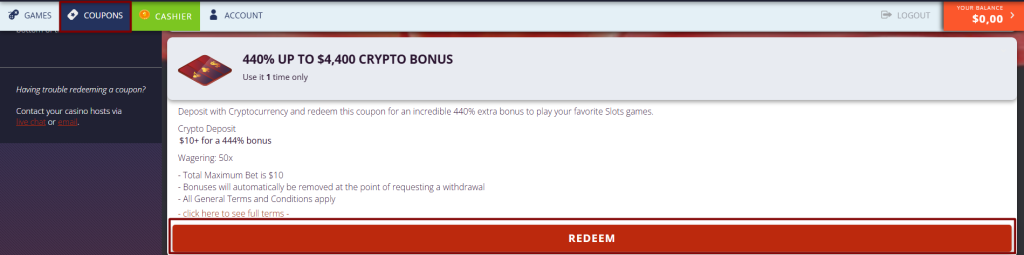 - The 444% bonus is applied automatically to your deposit once the coupon is active.