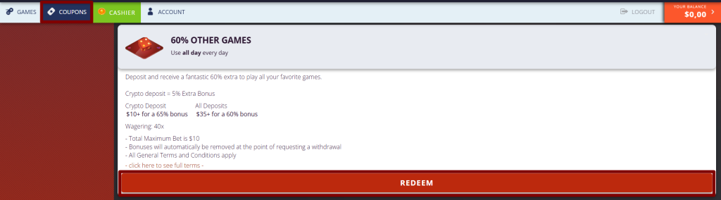 This guide explains how to claim Cherry Jackpot’s 60% bonus for non-slot games – available all day, every day with no limit on redemptions. Crypto users receive a boosted 65% bonus.