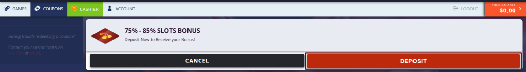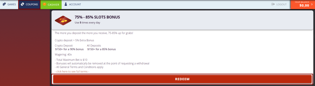 This offer is available up to 5 times per day, but the coupon must be redeemed before each deposit.