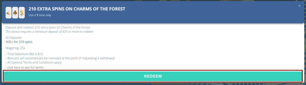 Look for the coupon titled “210 Extra Spins on Charms of the Forest”