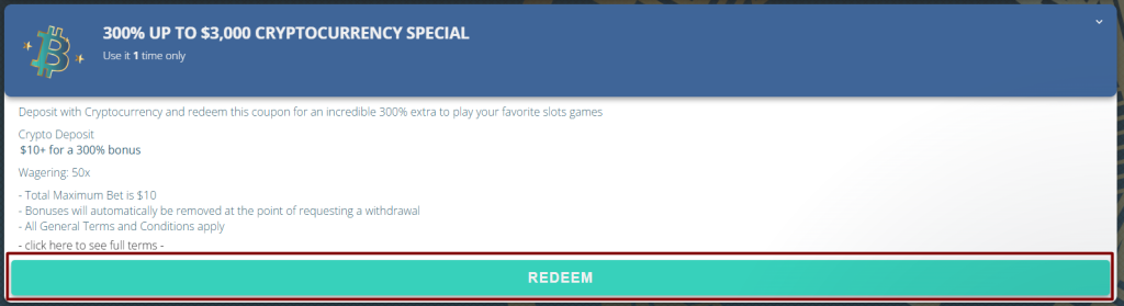 Locate the “300% Up to $3,000 Cryptocurrency Special” coupon.