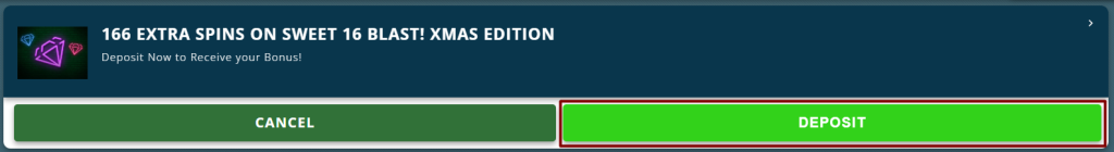 This guide explains how to claim CasinoMax’s 166 Free Spins on the new slot Sweet 16 Blast! XMAS Edition. This offer can be redeemed once per account and requires a qualifying deposit.