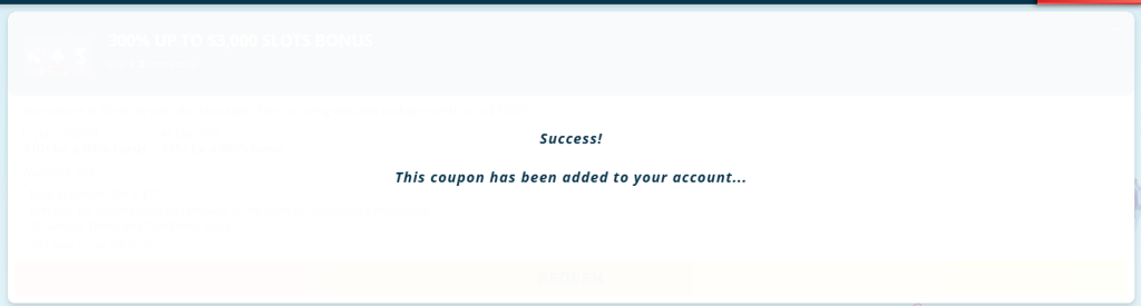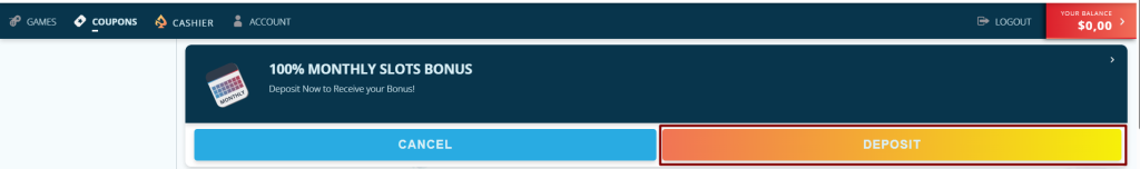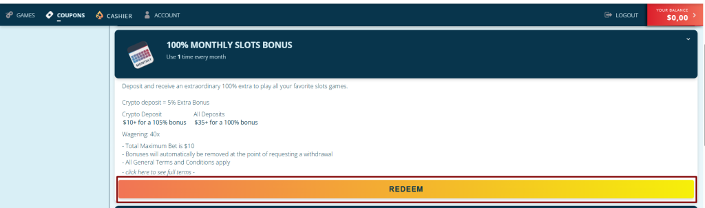 Find the “100% Monthly Slots Bonus” coupon and click the Redeem button.