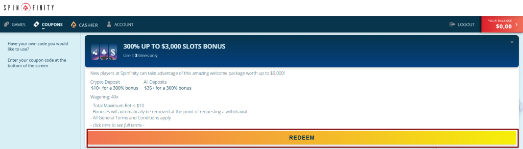 Find “300% UP TO $3,000 SLOTS BONUS (Use it 3 times only)” and click the Redeem button.
