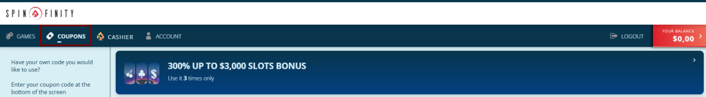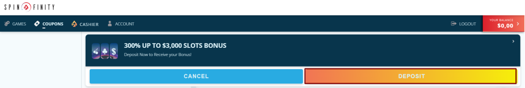 This guide explains how to claim Spinfinity’s 300% Slots Bonus, available up to three times for new players. This welcome package can reach a total of $9,000 in bonuses.