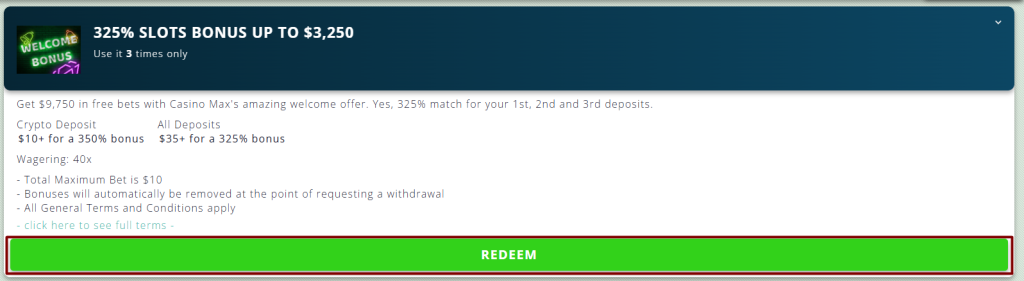 This guide explains how to claim the 325% Slots Bonus at CasinoMax. This offer can be used three times and gives players a 325% match on the first, second, and third deposits, up to $3,250 per bonus.