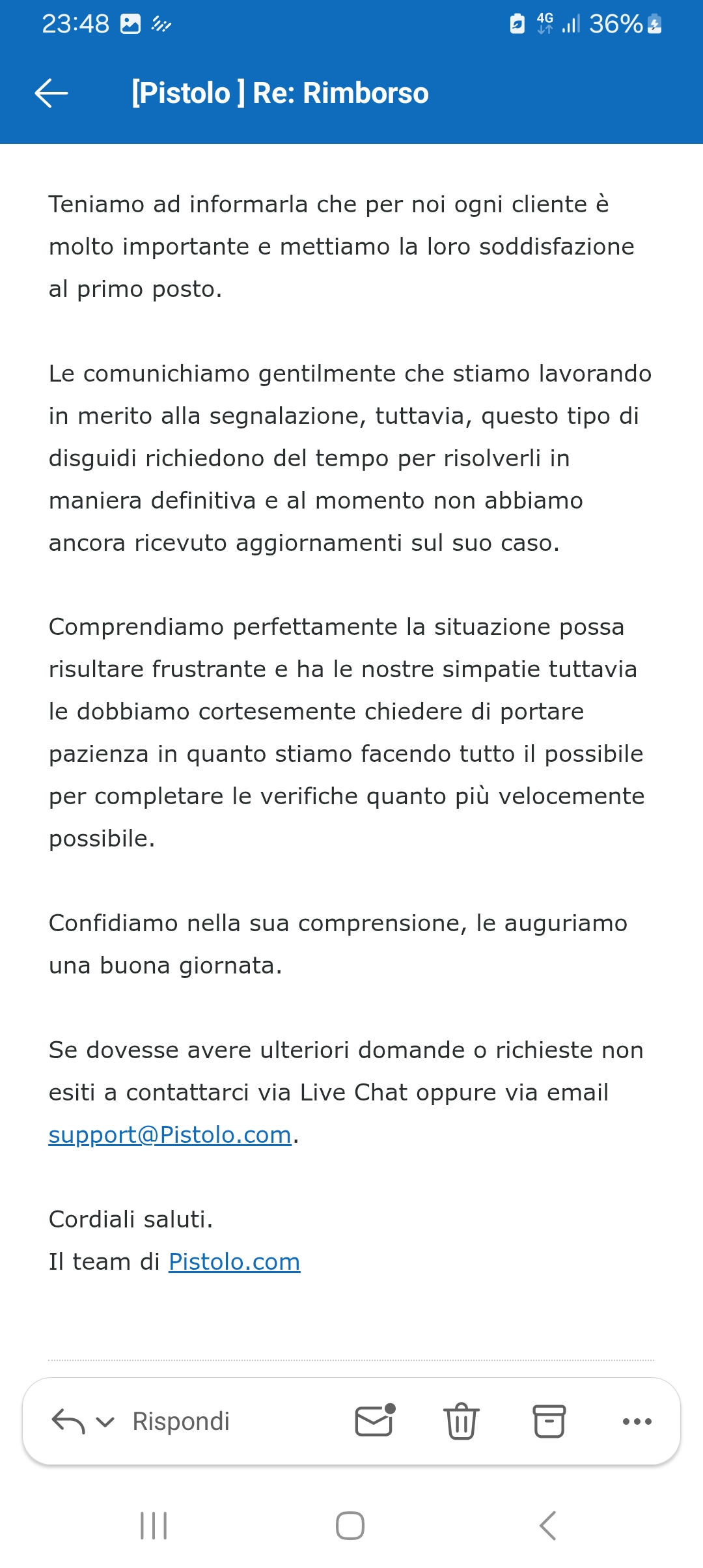 Pertanto, ti preghiamo di scriverci nuovamente dall’indirizzo email associato al tuo account, richiedendo un aggiornamento preciso (stato + tempi). Non appena riceverai la risposta, ti preghiamo di inoltrarcela qui.