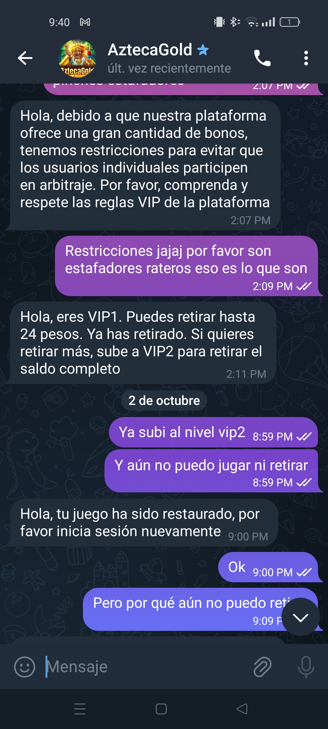 ¿Podrías por favor indicarnos tu nombre de usuario o ID de jugador en la plataforma AztecaGold? Esta información es necesaria para que podamos ponernos en contacto con el representante del casino en relación con su caso.