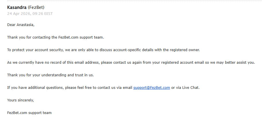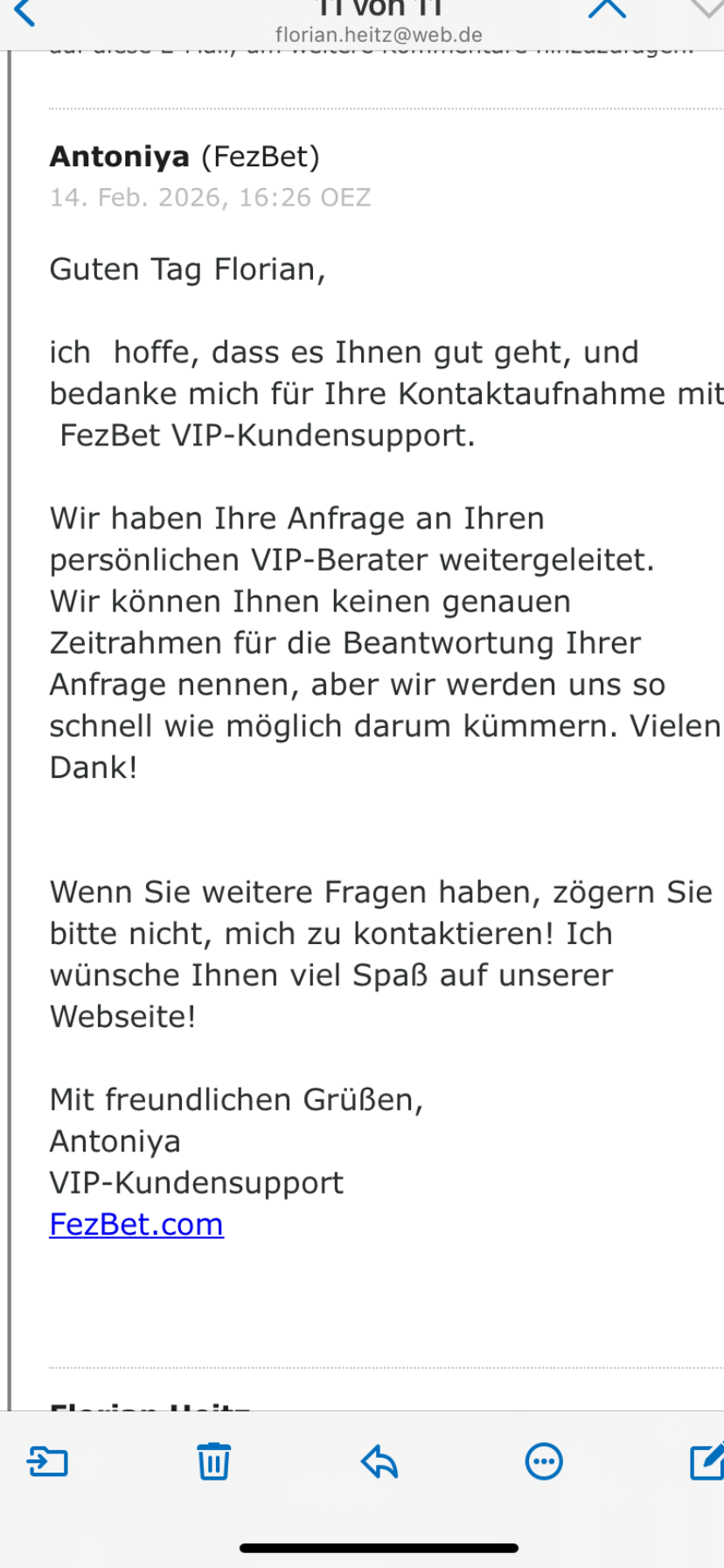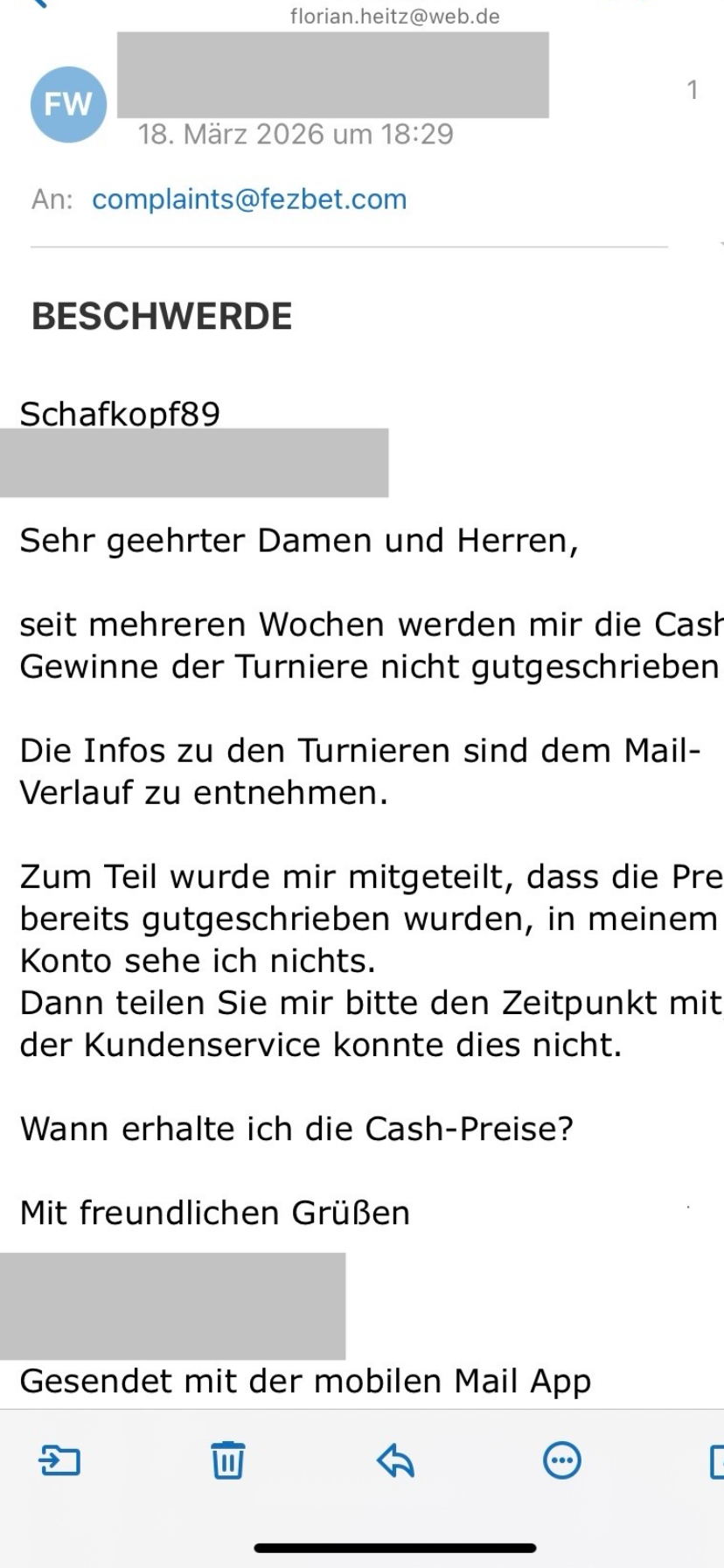 Wir dokumentieren dieses Ergebnis hier im Thread zur Transparenz. Falls Sie von Fezbet eine konkrete schriftliche Antwort erhalten (oder weiterhin keine Rückmeldung bekommen), können Sie diese gerne hier posten (bitte persönliche Daten schwärzen), damit der Verlauf vollständig nachvollziehbar bleibt.