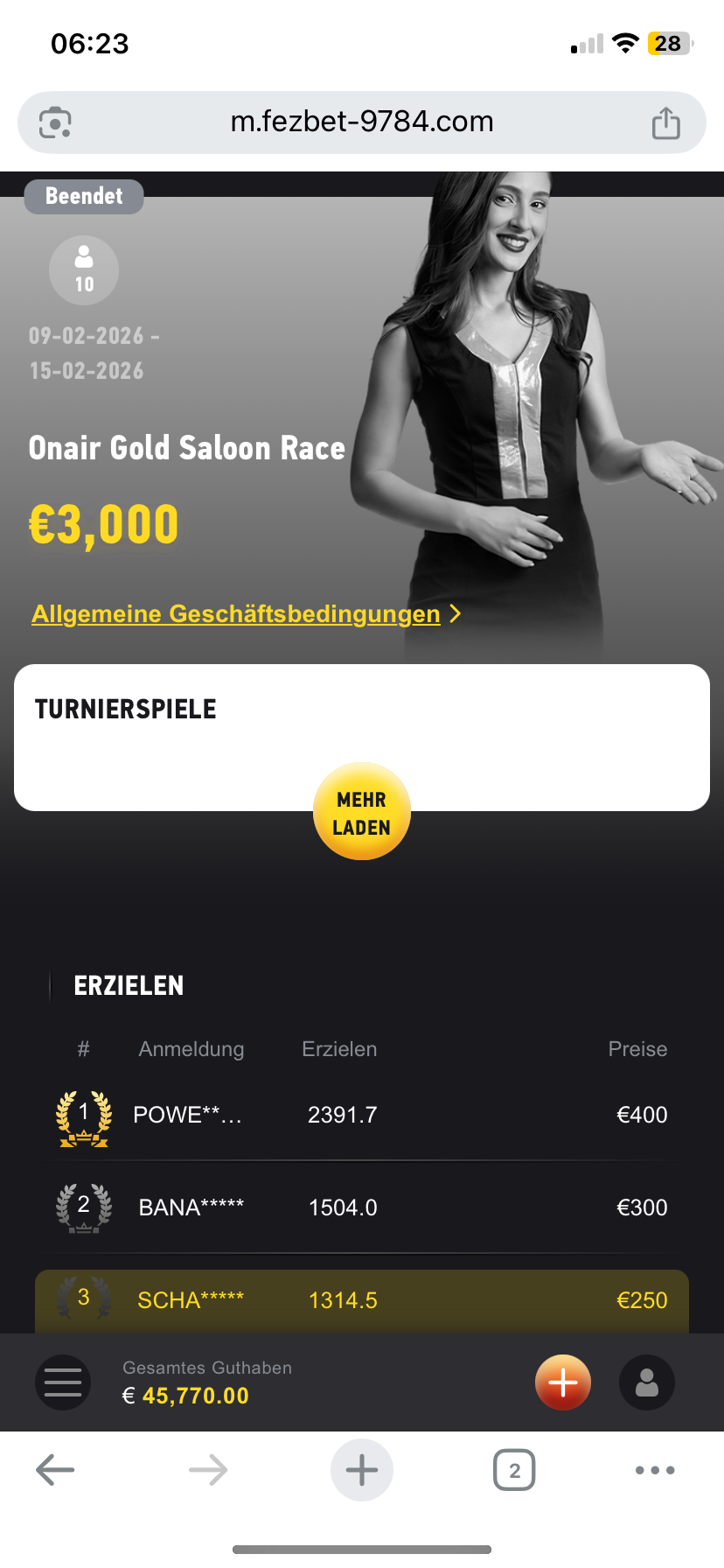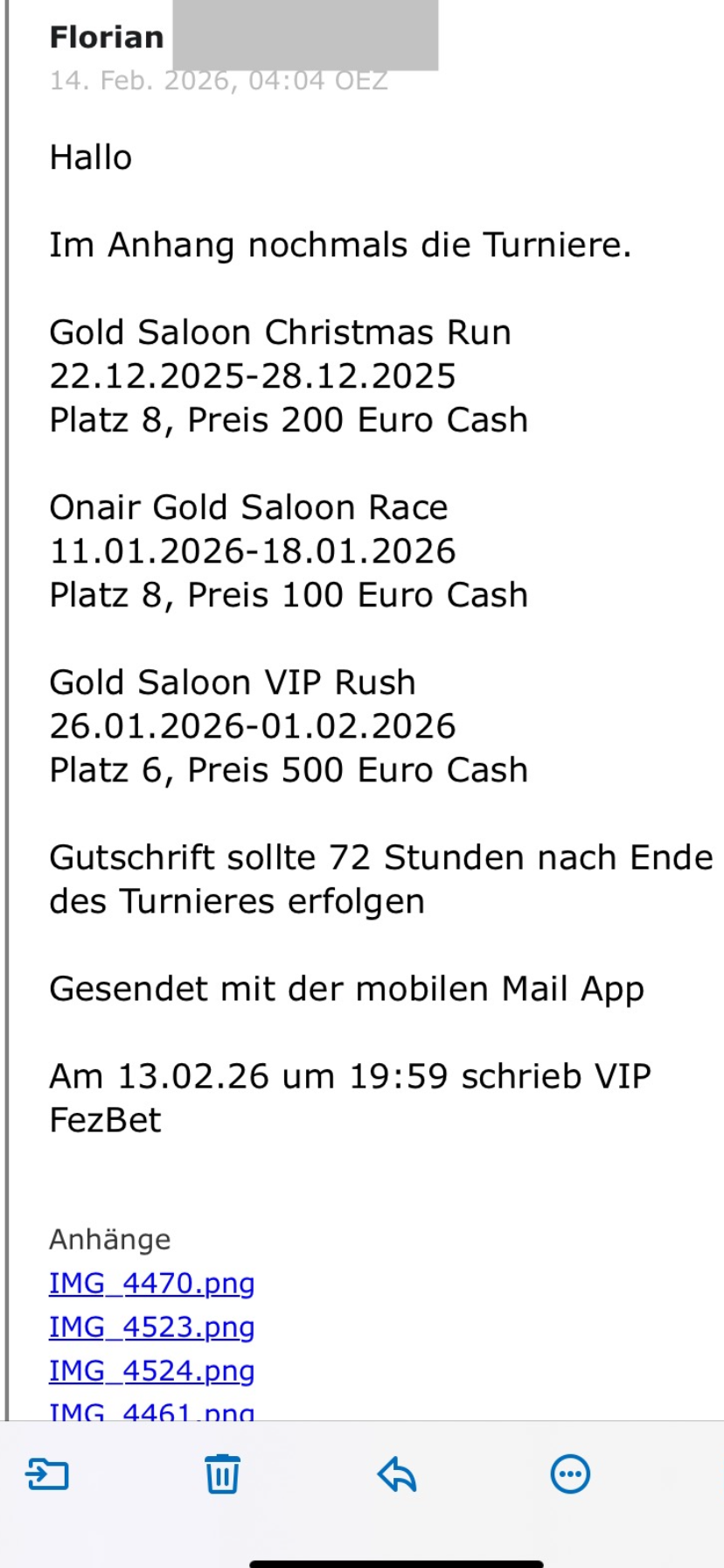 Wir haben Fezbet wegen Ihres Falls kontaktiert. Das Casino hat jedoch mitgeteilt, dass es aus Datenschutzgründen keine Details an Dritte herausgeben und den Fall ausschließlich direkt mit dem Kontoinhaber besprechen wird. Eine inhaltliche Klärung oder Prüfung der ausstehenden Turnierpreise hat Fezbet uns gegenüber daher nicht vorgenommen.